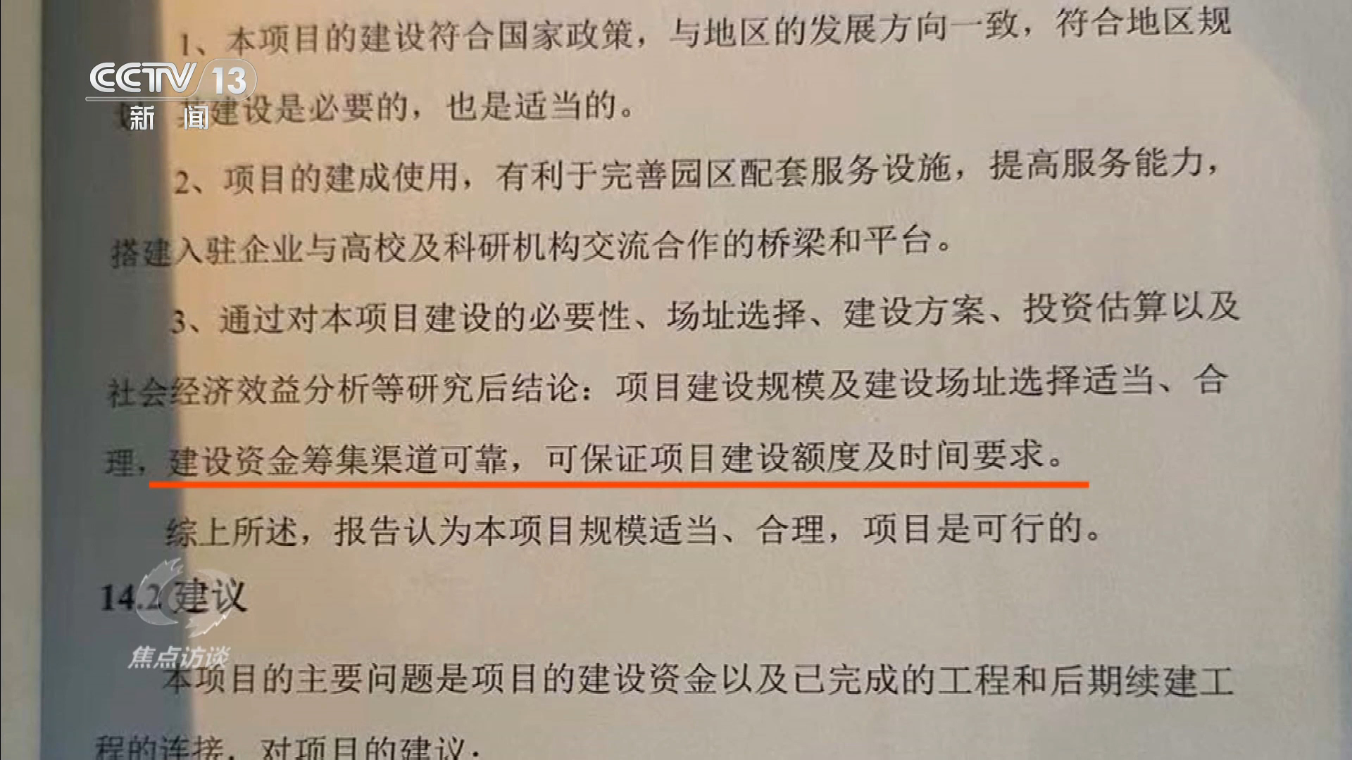 按照相关规定,在项目启动前,对项目资金进行精准测算、确保资金和工程的建设节奏相匹配是必须要做的工作。在这个创投园的《可行性研究报告》中,记者看到这样的结论:建设资金筹集渠道可靠,可保证项目建设额度及时间要求。显然,这个结论只是为了上马项目简单走了过场。